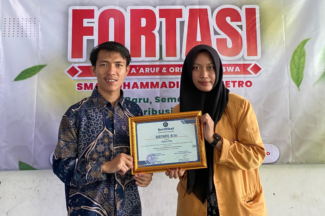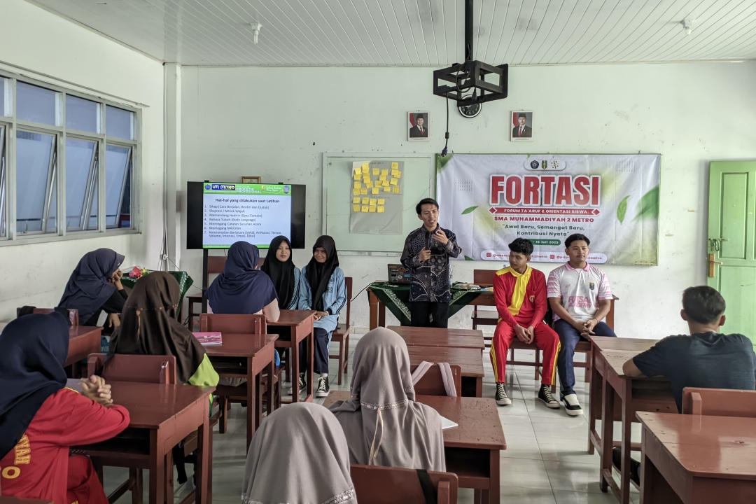 METRO - Dalam rangka membekali siswa-siswi baru dengan kemampuan komunikasi yang esensial, Program Studi Komunikasi dan Penyiaran Islam (KPI) Universitas Muhammadiyah Metro bersinergi dengan SMA Muhammadiyah 2 Metro (Muhasta) menyelenggarakan pelatihan Public Speaking dalam rangkaian kegiatan Forum Ta’aruf dan Orientasi (FORTASI). Kegiatan ini bertujuan untuk menumbuhkan kepercayaan diri siswa dalam berbicara di depan umum sejak dini.